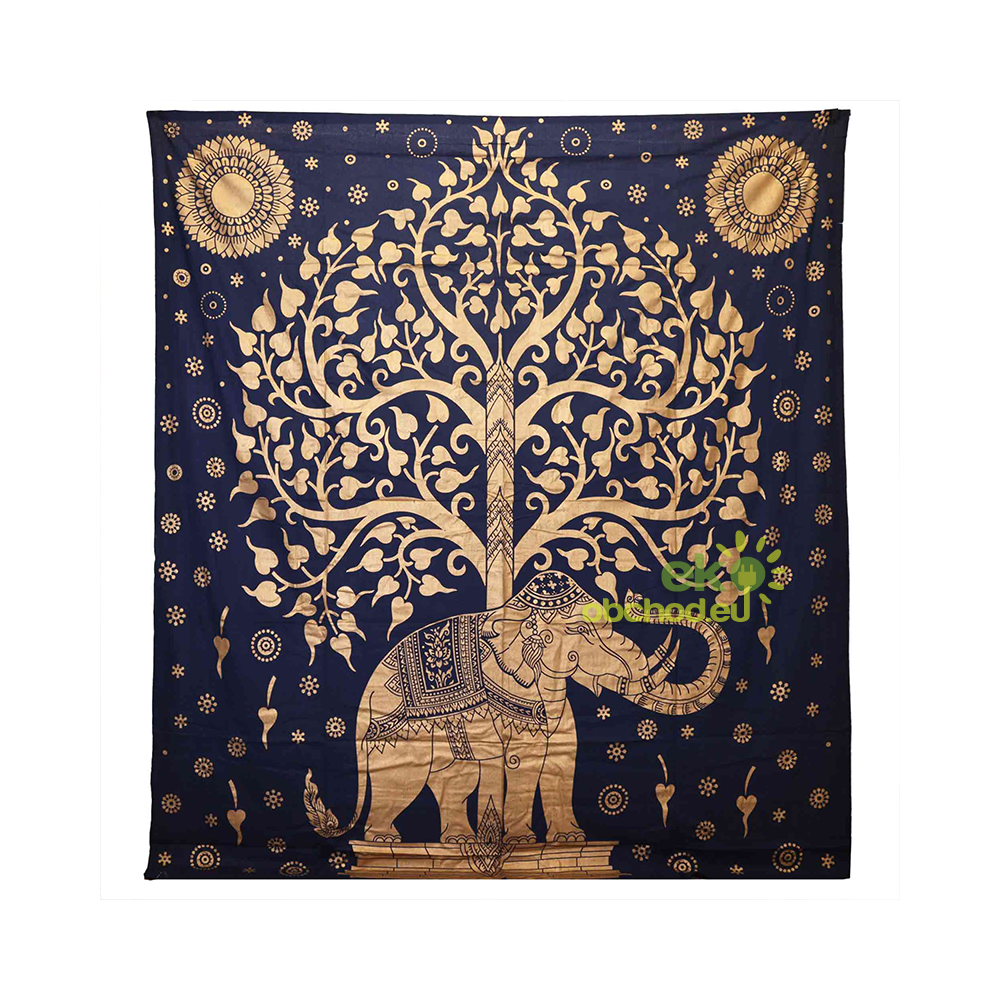 Dvojlôžková bavlnená prikrývka + Záves na Stenu, Slon a Strom, modro-zlatá