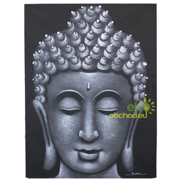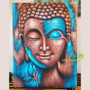 Obraz Budhu s bronzovo-modrým kvetinovým motívom spája výrazné farebné tóny s nadčasovou symbolikou Buddhu, vďaka čomu je vhodný do priestorov, ktoré si žiadajú výraznejší dekoratívny prvok pri zachovaní pokojnej atmosféry.