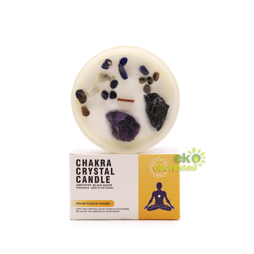 Zvýšte svoju osobnú silu a sebavedomie pomocou sviečky Solar Plexus Chakra. Táto sviečka obohatená ametystom a čiernym achátom stelesňuje esenciu čakry Solar Plexus. Vôňa „Deep in the Forest“ evokuje odvahu a sebaistotu.