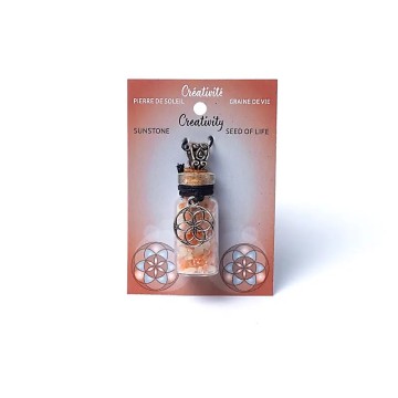 Sklenená fľaštička na koženej šnúrke - slnečný kameň so symbolom života