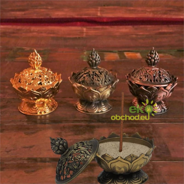 ID produktu: 4430Elegantná kadidelnica v tvare lotosu s uzáverom zdobeným tibetskými symbolmi priaznivosti. Možno použiť na pálenie vonných kužeľov alebo tyčiniek.