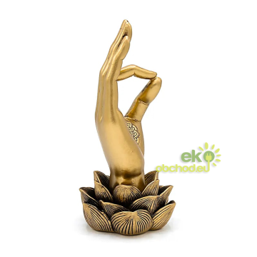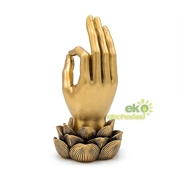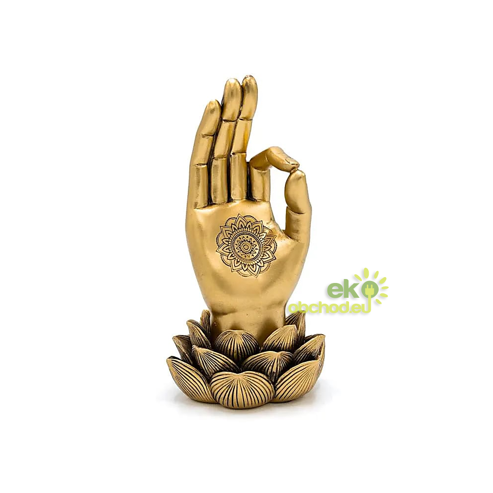 Zlatá ozdoba zobrazujúca ruku v Gyan Mudre, elegantne umiestnenú na lotosovom podstavci. Jemný motív mandaly v dlani umocňuje celkový výraz. Gyan Mudra, známa aj ako gesto poznania, tradične symbolizuje múdrosť, sústredenie a vnútorný pokoj.