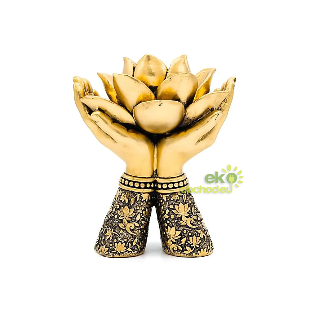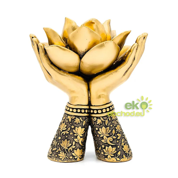 Zlatý svietnik na čajové sviečky v tvare rúk držiacich lotos.