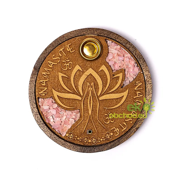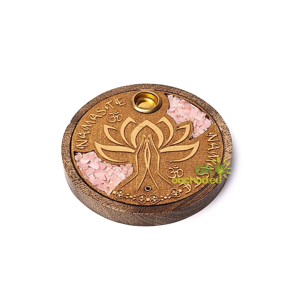 ID produktu: 4547Stojan na vonné tyčinky a kuželky s dekoráciou 'Namaste', obohatený o kúsky polodrahokamov z ružového kremeňa.