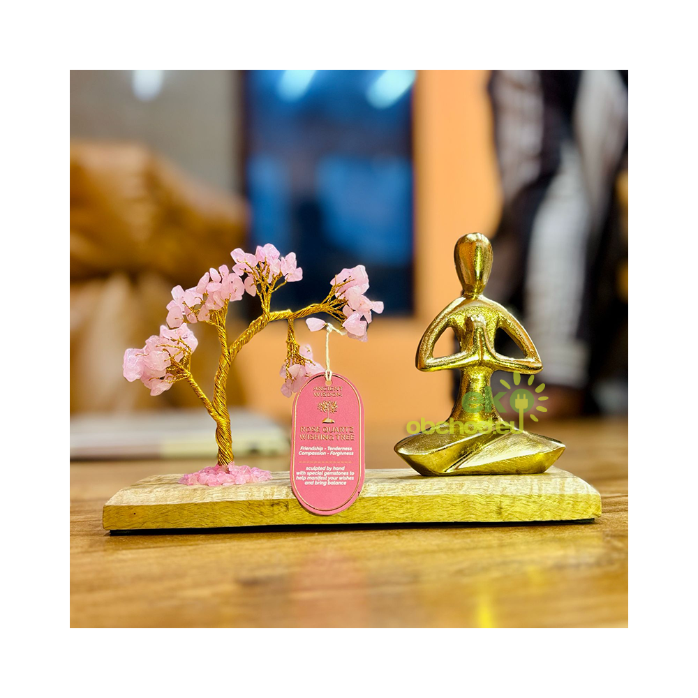 ID produktu: 4758Jóga záhrada z drahokamov ružového kremeňa so zlatou figúrkou – Naklonený strom a postava v póze Namaste je krásne vyrobený dekoratívny kúsok, ktorý spája duchovnú symboliku s umeleckou eleganciou.