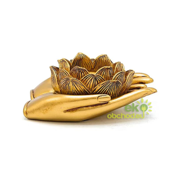 Zlatý svietnik na čajové sviečky v tvare dvoch rúk držiacich lotosový kvet. Rafinovaný dizajn zdôrazňuje pocit ochrany a osvetlenia, zatiaľ čo...